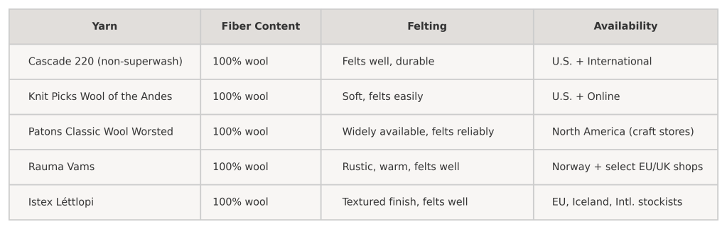 Cascade 220 (non-superwash) – a classic, durable wool that felts beautifully. Easy to find in the U.S. and great for slipper projects.