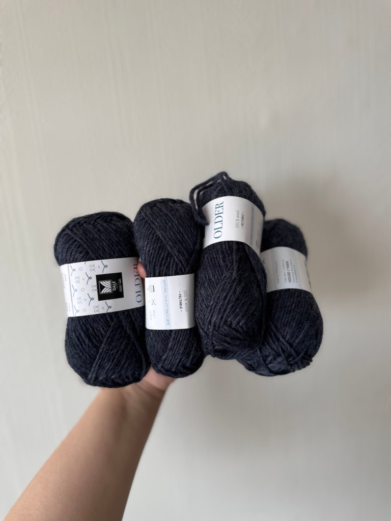For this project, I’m using Dale Garn Older – a 100% wool yarn that’s feltable, sturdy, and still soft enough for comfort. I chose a deep charcoal grey, which feels both warm and timeless — like something you’d always reach for at home.